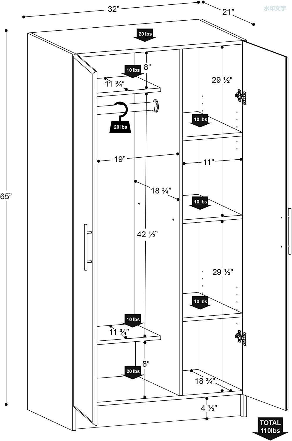 COMPACT: Measures 21" D x 32" W x 65" H with an internal wardrobe section measuring 18.75" D x 19" W x 42.5" and a side compartment measuring 18.75" D x 11" W x 29.5" H to expand your clothing storage capacity
