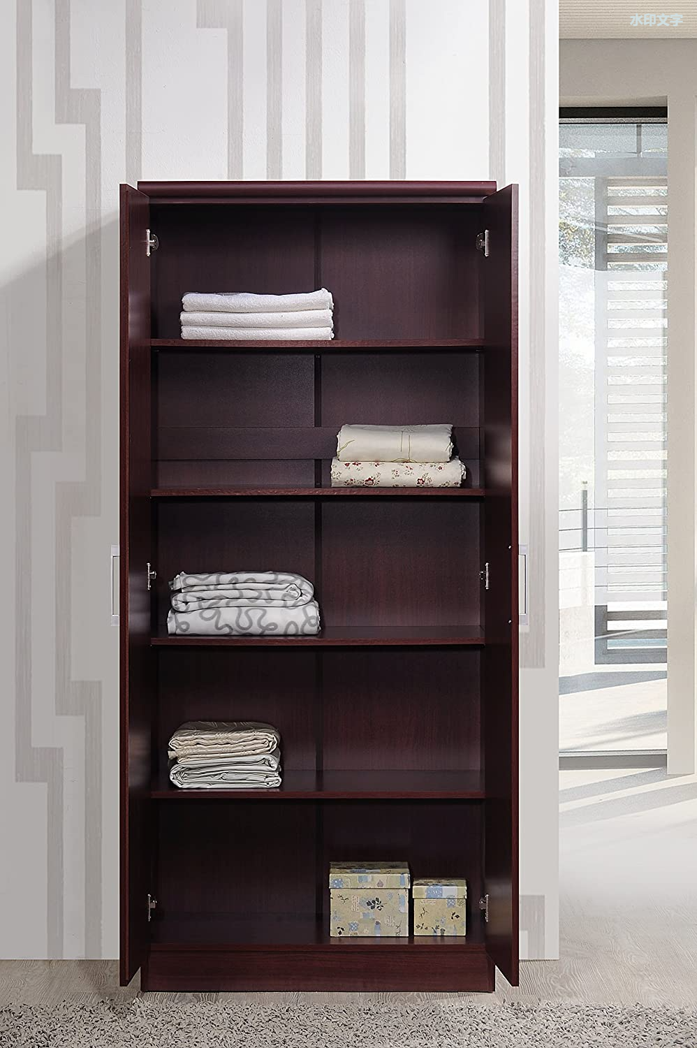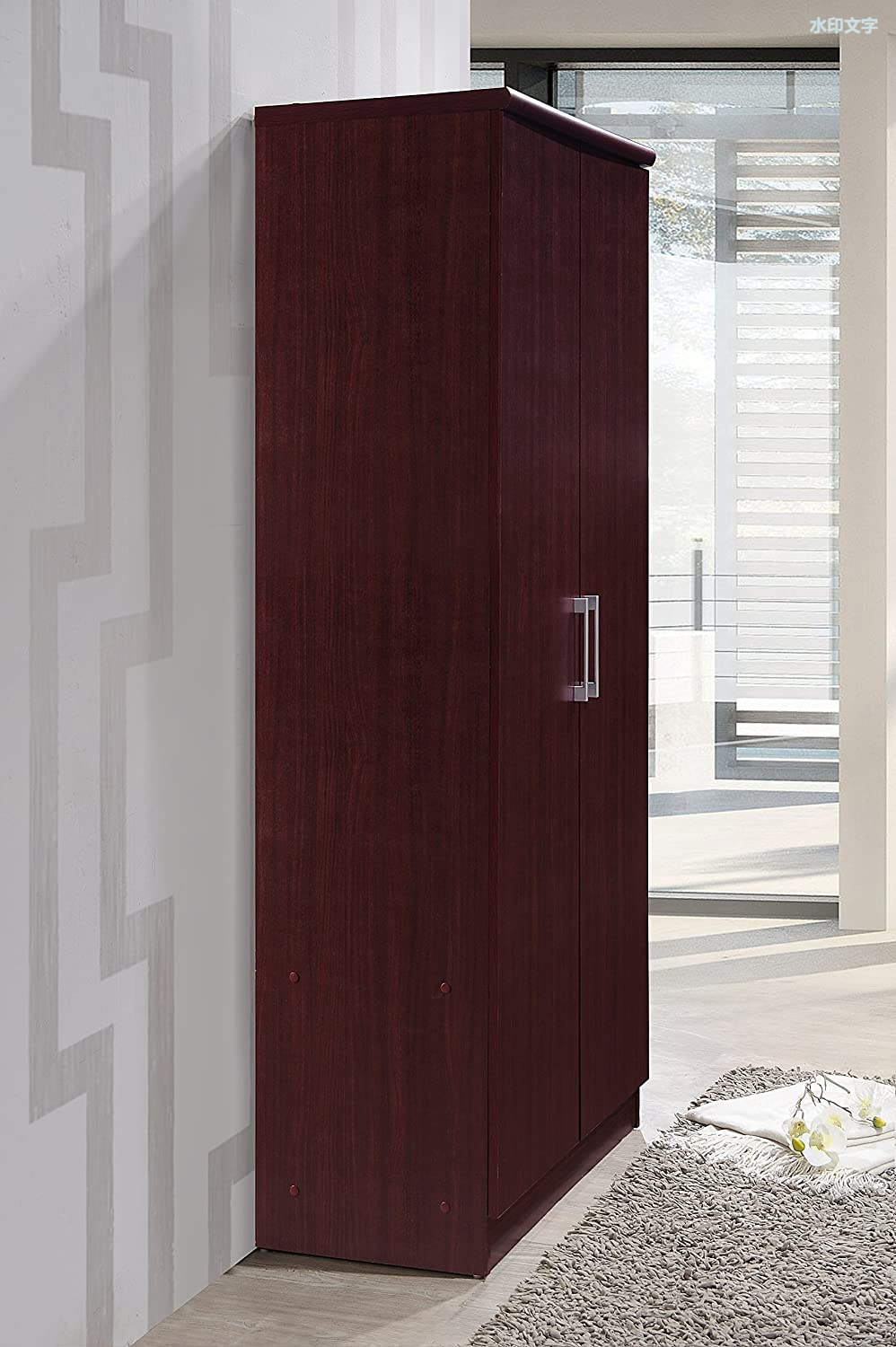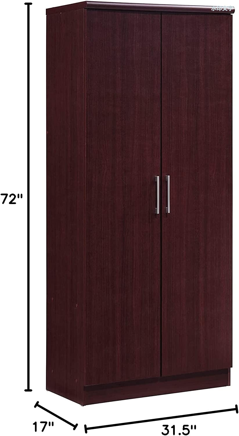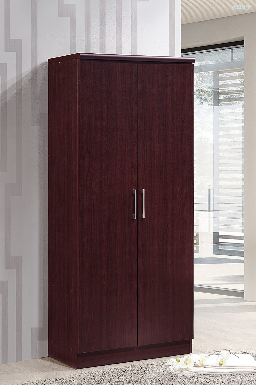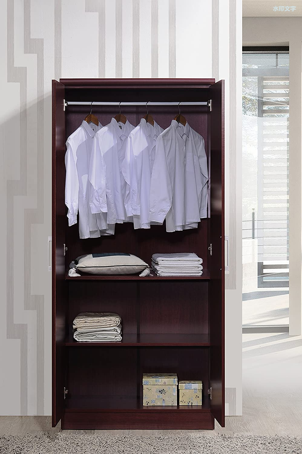 The Hodedah 2-Door Armoire with clothing rod is a beautiful, versatile addition to any bedroom. It is constructed of sturdy, durable, top quality wood. Available in a laminated finish in a variety of colors to choose from. Equipped with an optional clothing rod that is the width of the closet, one fixed and three adjustable shelves. This Armoire can not only be used for storage in the bedroom but in the kitchen as a pantry, in the library to store books, in the laundry room to store linen, in the garage to store tools and much more. This multi-use armoire blends well with both traditional and contemporary decors.