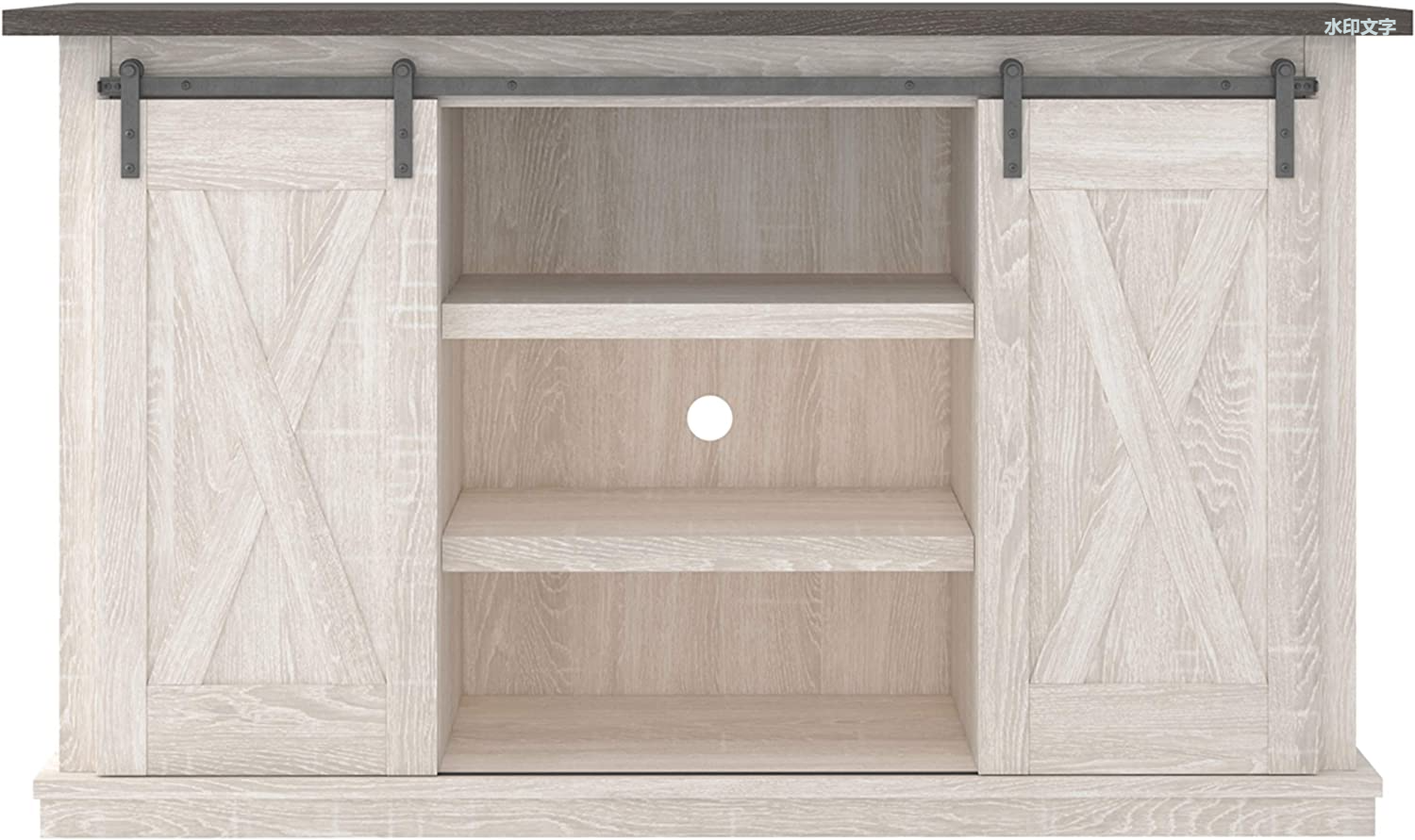 BEAUTIFUL CRAFTSMANSHIP: Made of decorative laminate and engineered wood this TV stand features a two-tone replicated gray wood top with an antique white base