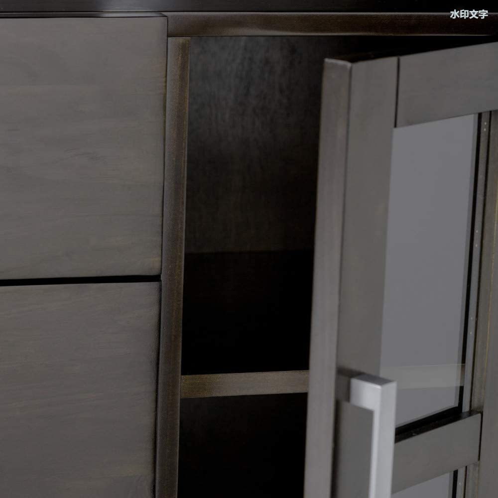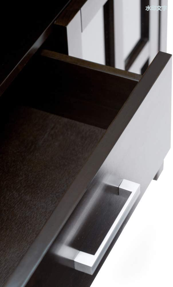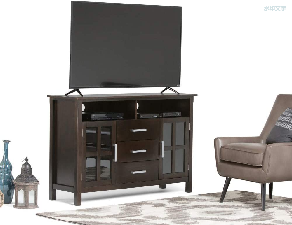 Comes with tempered glass doors that open to cabinets with one (1) adjustable shelf each, three central drawers with metal drawer glides and open top space for media devices.