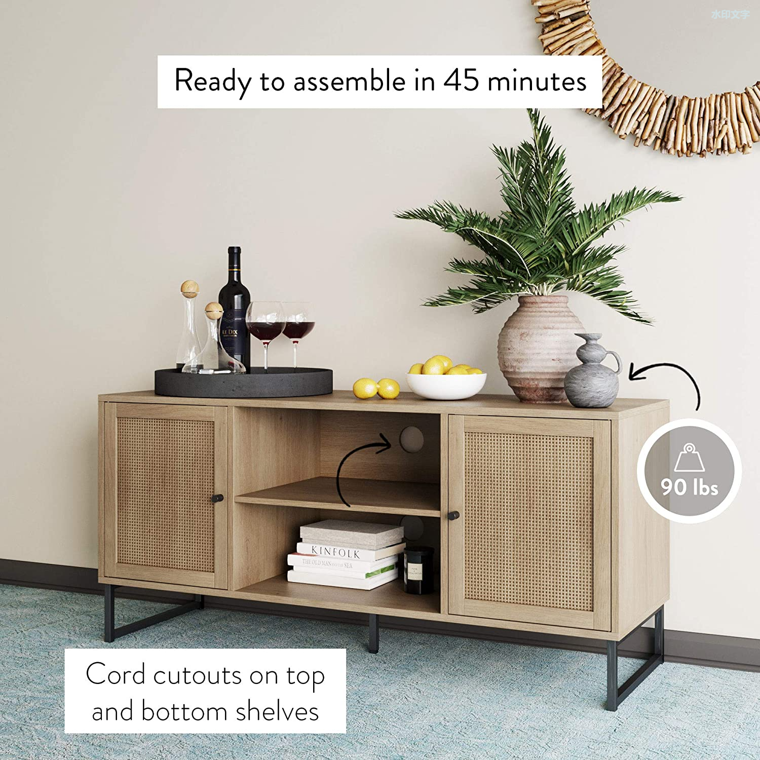 a unique and modern TV stand with its rattan details of texture on its cabinet doors that gives this entertainment console a sleek boho-chic design.